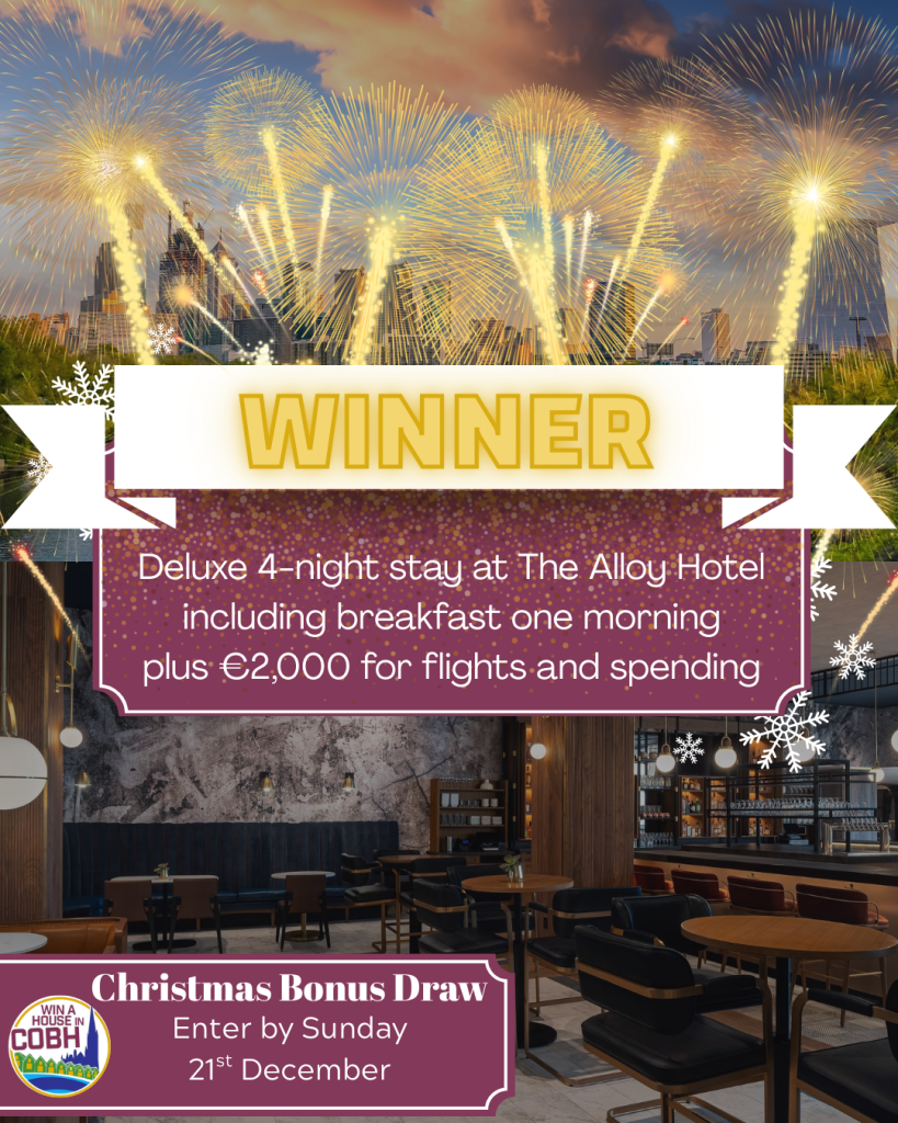 Eccles Hotel Getaway Bonus Draw Winner – Albert Brown from Waterford won a 2-night B&B stay for two at the Eccles Hotel in Glengarriff, plus €1,000 spending money and 20 FREE Win A House In Cobh tickets